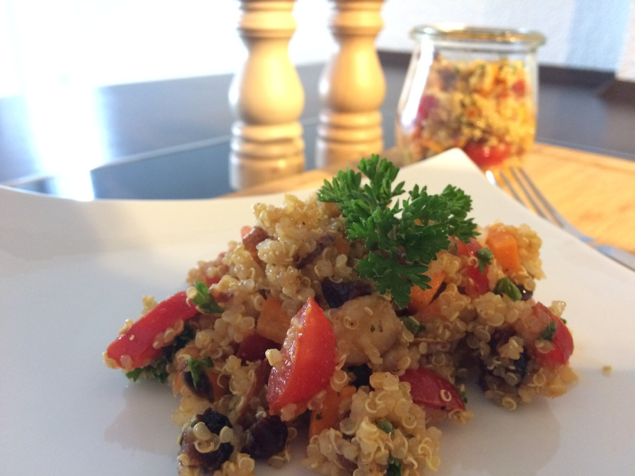 Gemüse und Kräuter waschen und klein schneiden/ hacken, zusammen mit dem Quinoa, den Cranberries und den Mandeln in eine Schüssel geben.